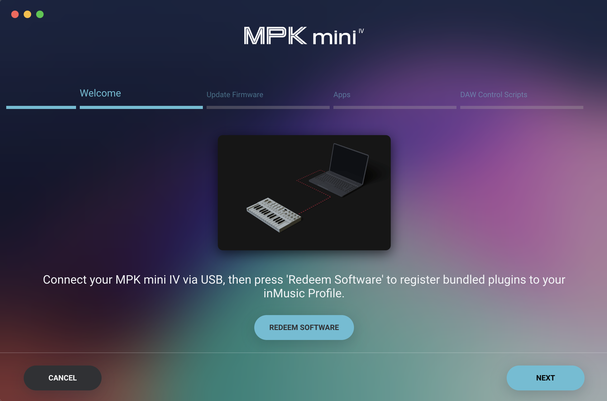 MPK mini IV とPCを接続していない場合はUSB ケーブルで接続の上で、[NEXT] をクリックします。