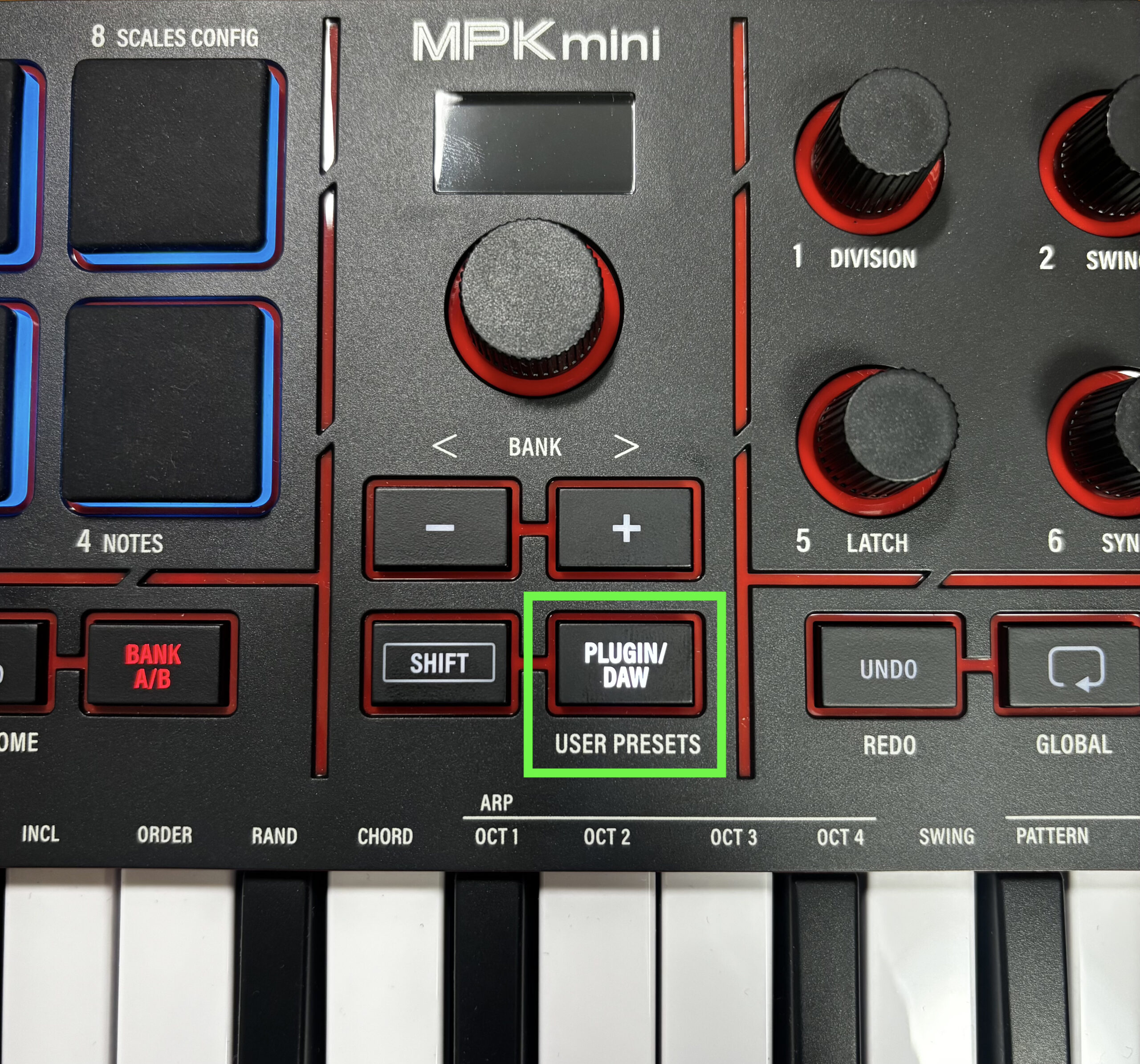 なお、本体右上にある8つのノブを回しても反応がない場合は、[PLUGIN/DAW] ボタンを押して、白色に点灯させてください。