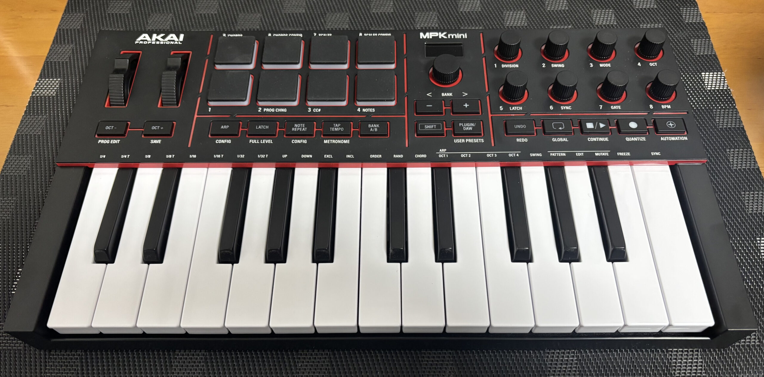 MPK miniシリーズの定番機能であるアルペジエーターとノートリピートも健在。
