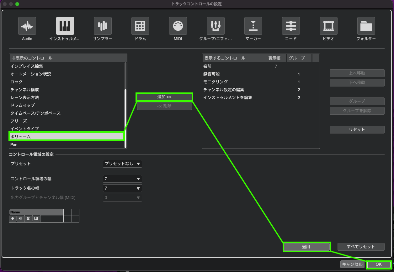 設定手順は、任意のトラックを右クリックし、[トラックコントロールの設定] をクリックします。