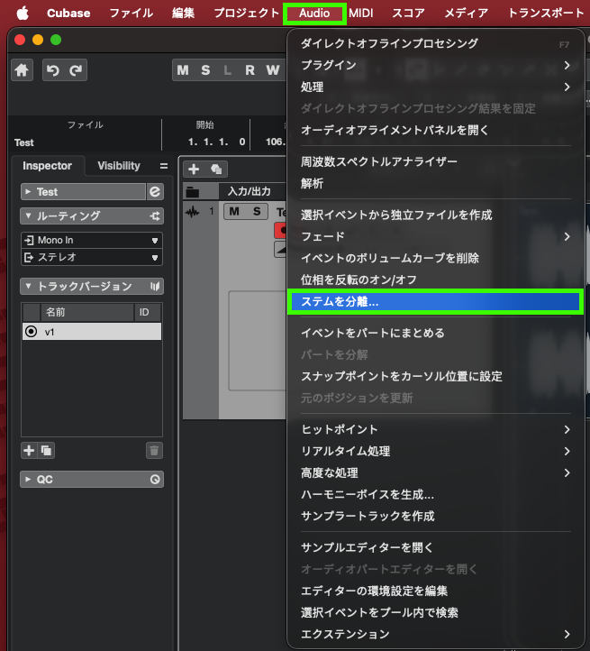 上メニューより、[Audio] – [ステム分離] をクリックします。