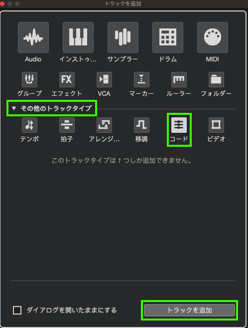 コードトラックの作成は、[その他のトラックタイプ] – [コード] – [トラックを追加] より追加が可能です。