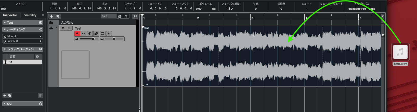 - まずは使用するトラックを Cubase 内にドラッグ&ドロップで取り込みます。